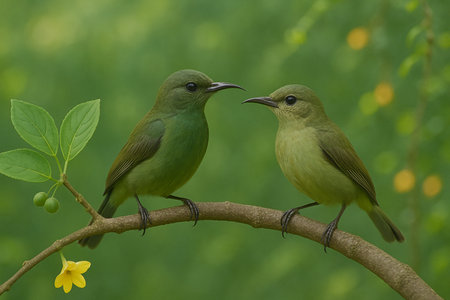 AI generated realistic image of a male and female olive sunbird perched side by side on a branch in a vibrant green forest with soft daylight and a peaceful natural atmosphere