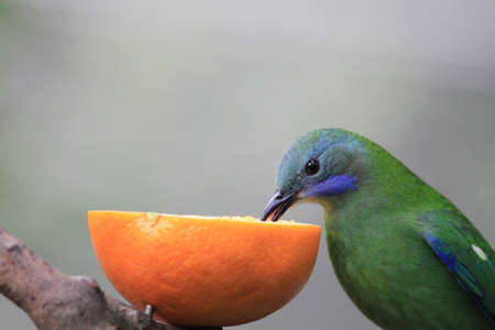 Portrait of a Collared Sunbird, Hedydipna collaris, posed in front of a plate with some fruit. The blurred background is colored green.