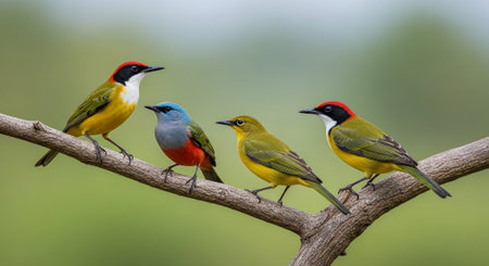 Generative AI : Cute bird Green Broadbill Calyptomena viridis rest on branch in nature