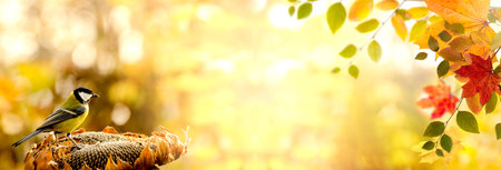 Autumn Banner with Great tit bird against blurred Natural background decorated with colored autumn leaves. Thanksgiving concept with copy space.