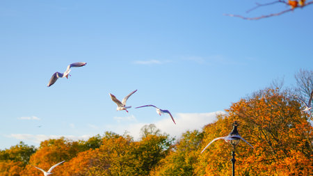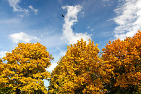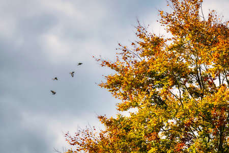 Beautiful autumn landscape with fallen leaves in the meadow and flying birds