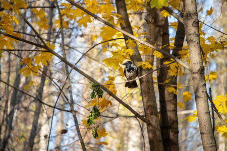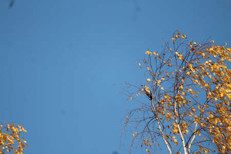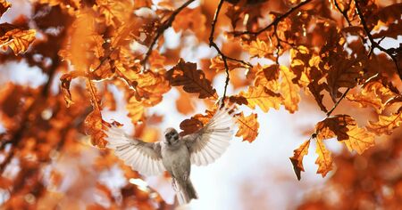 natural background with a bird flying on the background of an oak branch with Golden leaves in the autumn Sunny Park