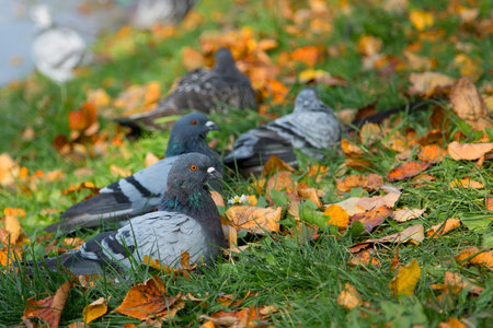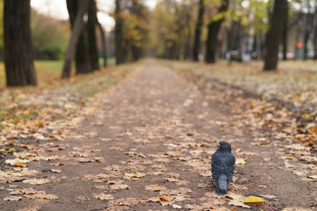 pigeon on autumn alley in town, copy space for yopur info