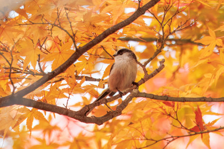 Long-tailed tit on a branch of maple tree with red leaves.