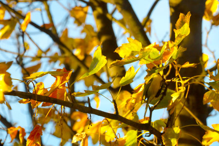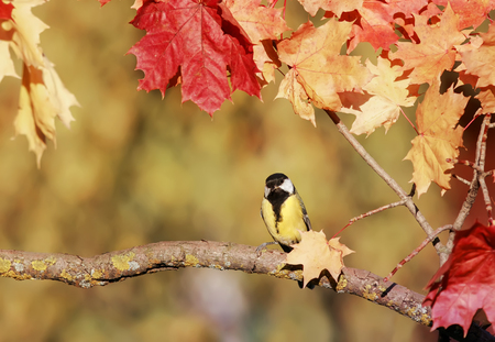 A tit bird sits on a branch of the autumn maple