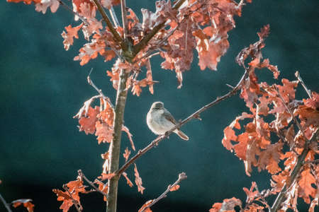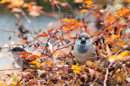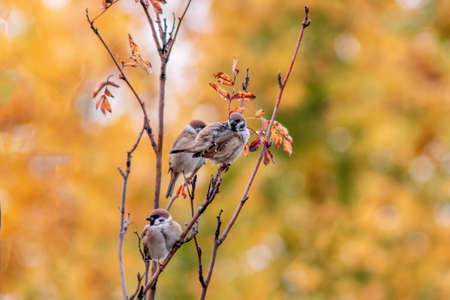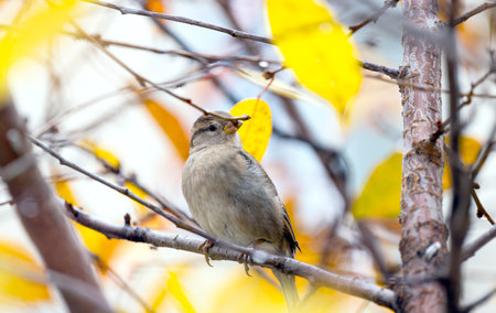 A sparrow on a tree close-up in autumn