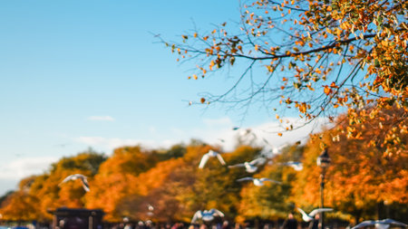 Flock of ducks floating on calm pond in Hyde Park during colorful autumn season. High quality photo