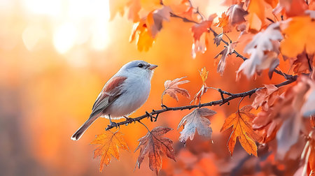 A tiny passerine perches delicately on vibrant autumn foliage, set against a soft, multicolored backdrop evoking serenity and seasonal change.