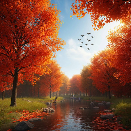 Vibrant fall foliage, river, and flying birds in a serene forest