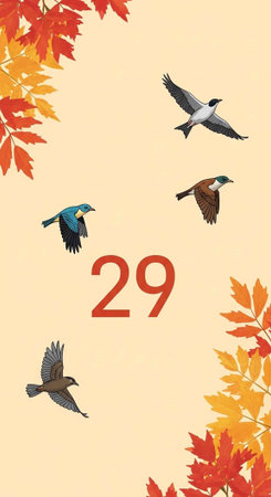 A colorful illustration of birds flying with autumn leaves and the number 29