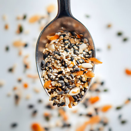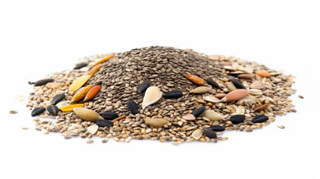 Explore a captivating array of seeds and grains showcasing diverse shapes and textures on a light background, ideal for nature and agricultural themes.