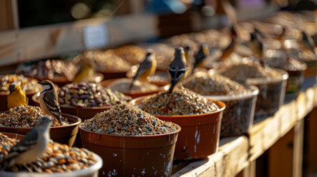 A colorful bird blends into a varied assortment of seeds surrounded by bright petals, showcasing nature's beauty and the tranquility of a lively ecosystem.