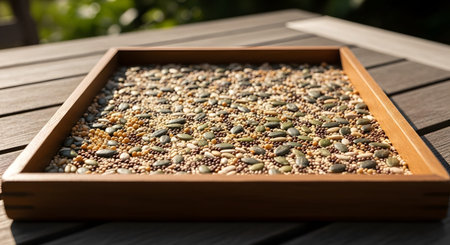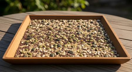 A shallow wooden tray is filled with a healthy mixture of seeds, including pumpkin, sunflower, and sesame seeds. The image showcases the texture and variety of these nutritious organic ingredients.