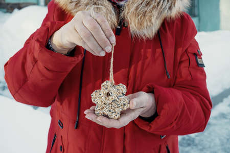 unique homemade hand bird feeder, a bird feeder in the shape of a star, formed from different types of grains. Protection of wild birds in nature in the cold season. the feeder is in women's hands.