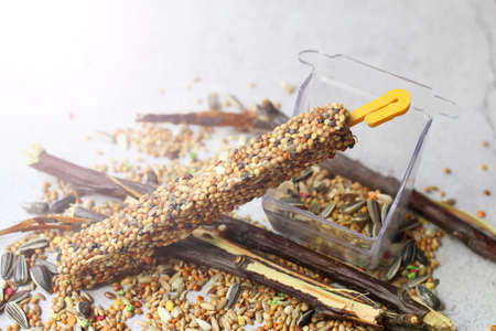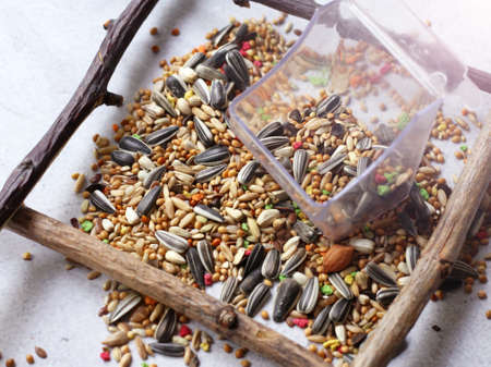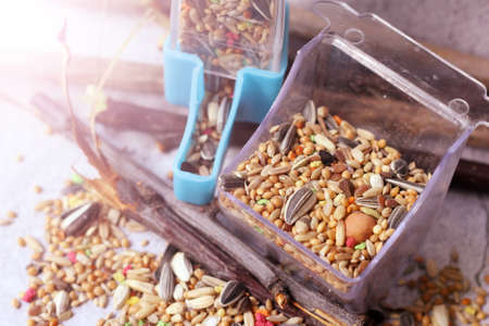 Closeup of a feed for Budgerigar. Closeup of grain, bird feed.