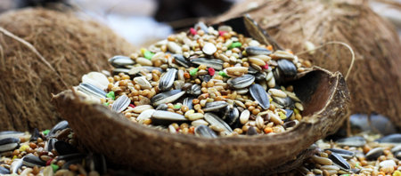 Food for exotic parrots in coconut top view