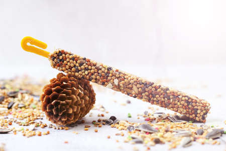 A treat for parrots, birds and a pine cone.