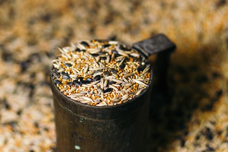 Birdseed grain poured in a vintage mug. close-up.