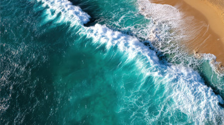 Aerial view of turquoise ocean waves breaking on sandy beach generative AI