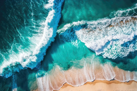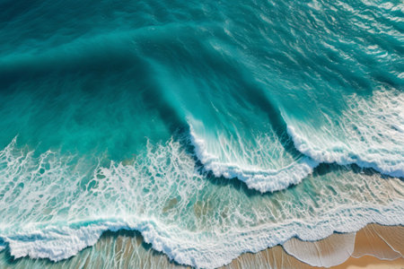 Top view ocean waves turquoise coast. Blue waves hit sandy shore from above, perfect for marine landscape photos.