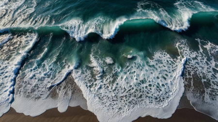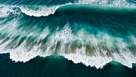 An ocean waves in motion with white foam patterns creating dynamic and energetic seascape from aerial view