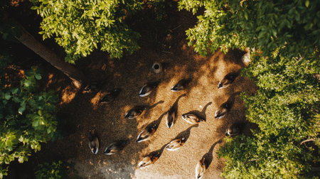 Top view of ducks resting in a shaded area at the farm, surrounded by trees and soft ground cover.