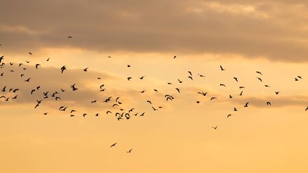 Flock of Birds silhouette in the sky at pink sunset. Birds are leaving for the winter.