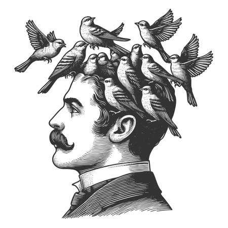 man in formal attire with an open head, from which birds are flying, symbolizing creativity and imagination sketch engraving generative ai vector illustration. Scratch board. Black and white image.