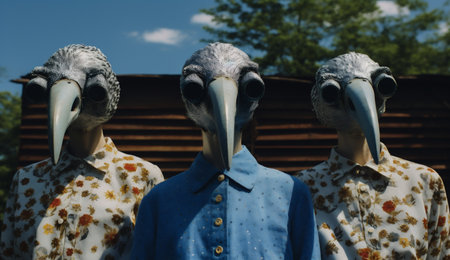 Closeup of a group of people wearing birds masks in a park in the summer
