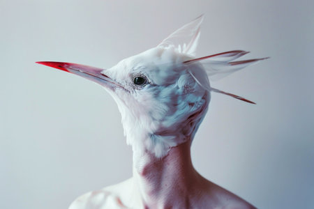 A man's face is covered in birds, giving the impression of a bird's head. Concept of chaos and disarray, as the birds are scattered all over the man's face