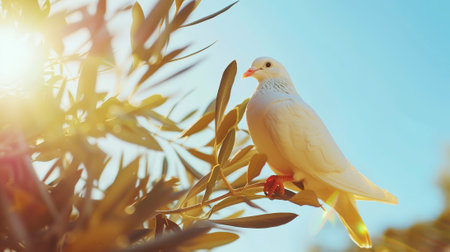 White dove sits on olive tree. Sunny day, light blue sky backdrop. Peace concept. Generative AI.