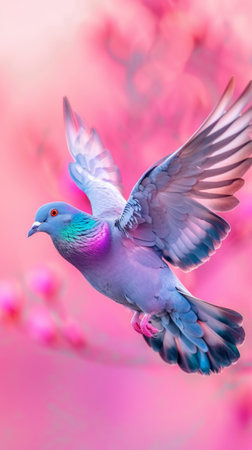 Majestic pigeon in flight against a dynamic, multicolored swirl background