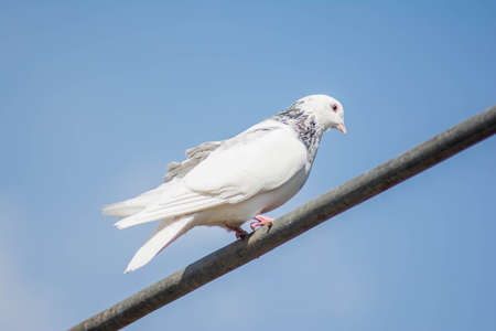 A beautiful white domestic pigeon standing alone on a wooden loft