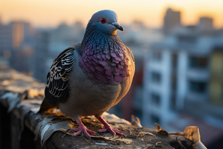 Iridescent Pigeon watches the city among historic skyscrapers at sunset., generative AI