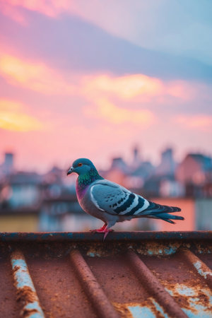 AI Generated. Pigeon on Rooftop in Morning with Beautiful Scenery