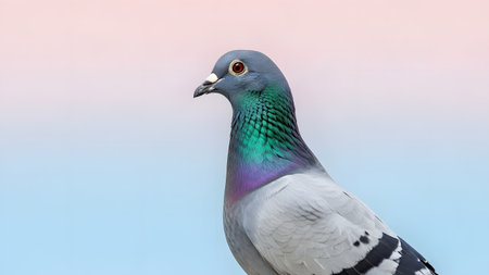 A stunning profile portrait of a rock pigeon, capturing the iridescent purple and green feathers on its neck. The bird is isolated against a soft, gradient background of pastel pink and blue.