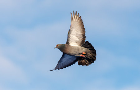 A pigeon is flying in the sky with its wings spread out. The bird is white and gray, and it is soaring high above the clouds. The sky is clear and blue, and the bird's wingspan is impressive