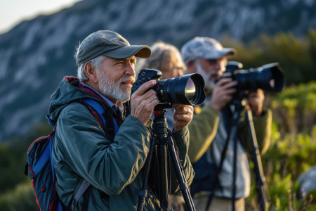 Senior nature photographers taking pictures on mountain with telephoto lenses