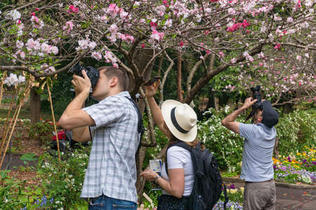 Sydney, Australia - September 23, 2017: People taking photos of flowering trees in Royal Botanic Garden in Sydney
