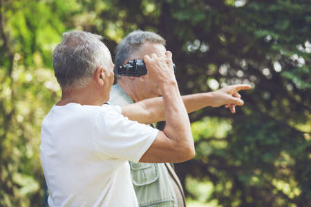 Two senior friends enyojing nature using binoculars.
