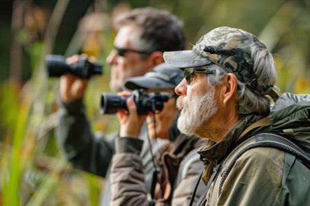 shot of a group of people watching birds with binoculars, created with generative ai