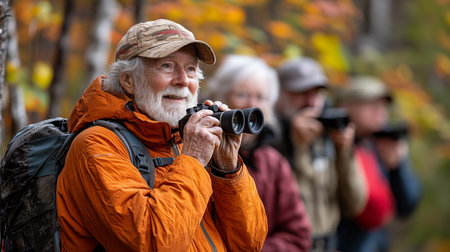 a Caucasian retired man hiking with a photography group, capturing nature shots