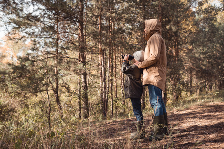 side view of father and son looking through binoculars while standing together in forest