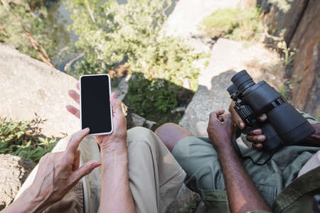 Top view of senior tourist pointing at smartphone near african american husband with binoculars on stones
