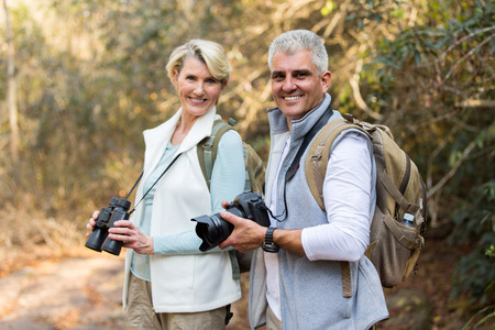 Two seniors with camera and binoculars in forest