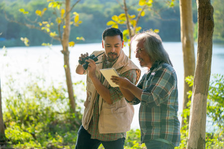 Young Asian man hold binoculars and discuss with senior man who hold book that record some data and they look happy with some new finding.