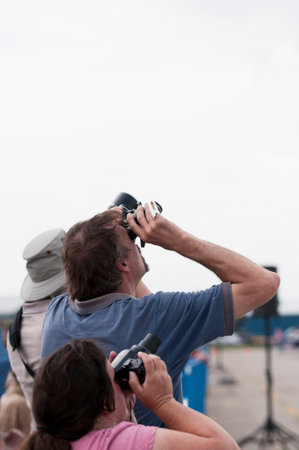 Group of many people watching planes landing and take off airport runway field planespotting conference warm morning time. Planespotters in safety vest waiting aicraft arrival approaching departure