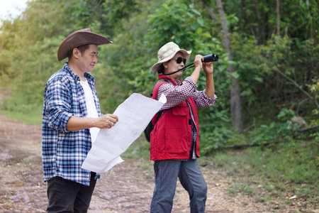 Asian man and woman travellers holds binoculars and paper map to explore natural route for trekking. Concept,Ecology study. Pastime activity, lifestyle. Explore environment. Travel