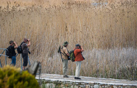 Prespa, Greece - May 03, 2015, photographers on Prespa Lake photographing birds with telephoto lenses
