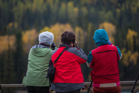 A group of photographers captures stunning autumn scenery in a lush forest. Each person is dressed warmly, focused on the landscapes through their cameras.